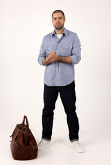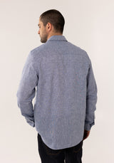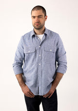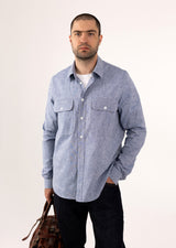 Atelier of Shades men's button-down work shirt crafted from a linen-cotton. Styled with a regular collar, front buttoning and two chest pockets with buttoned flaps. Regular fit.