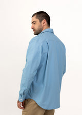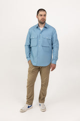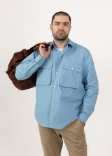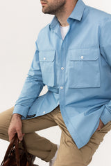 Atelier of Shades men's travel shirt-jacket in sky blue with front placket and two voluminous chest pockets. Team the shirt with your favorite denim and light sneaks for an easy effective look.