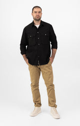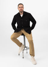 The Atelier of Shades men's waterproof black travel shirt-jacket features a front placket and two oversized chest pockets. Pair with your favorite jeans and lightweight sneakers for a casual yet stylish look.