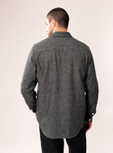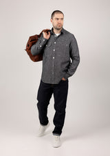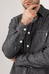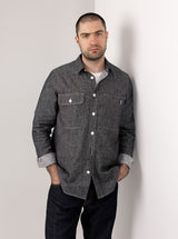 The men's black cotton mix worker shirt by Atelier of Shades takes inspiration from vintage American Worker styles. Made up in a cotton and linen mix the shirt features a regular collar, two chest pockets, and a curved hem. Tailored fit give this piece a timeless appeal, perfect for pairing with dark denim and sneakers for effortless sophistication.