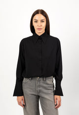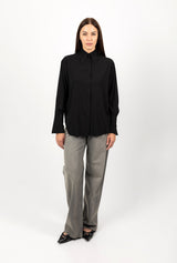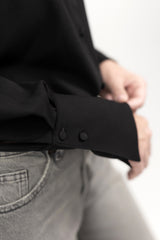 Our black viscose shirt with elegant cuffs is made of 100% viscose. The shirt features a pointed collar, button stand with handmade buttons and oversized cuffs with our signature button detail. This shirt has been designed with a beautiful blend of style and comfort, making it perfect for any occasion.