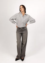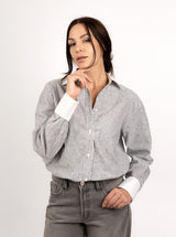 Women’s classic shirt, straight fit button down shirt in black stripe cotton. Combo cuff and collar. Center front placket.